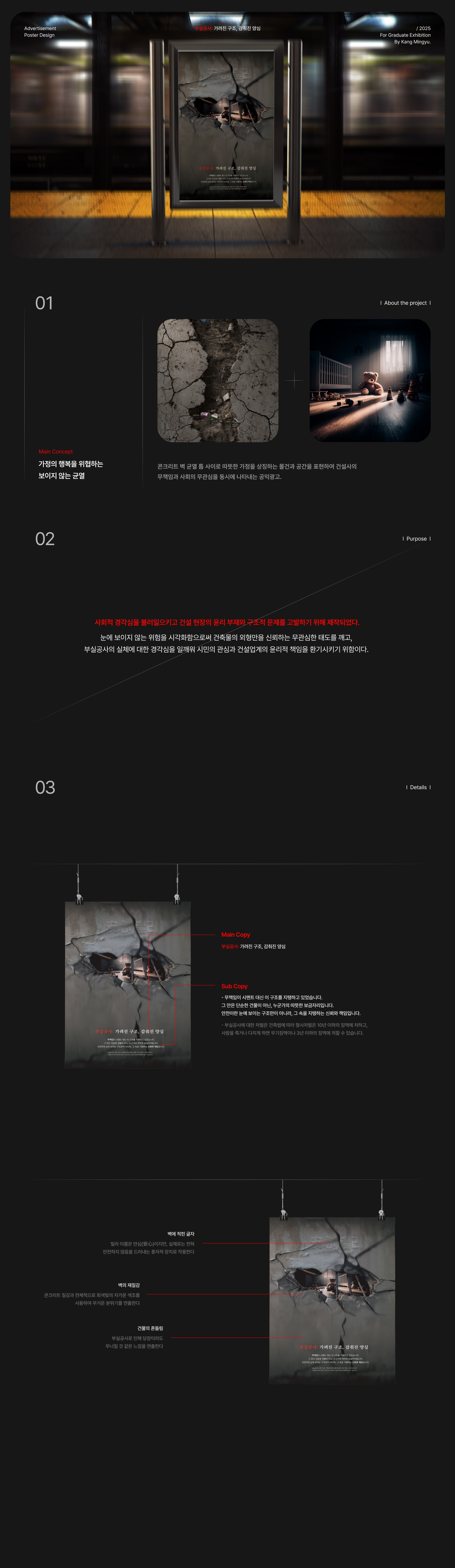 건설 현장의 부실 시공으로 인해 시민의 생명과 안전이 위협받는 현실을 고발하는 공익광고