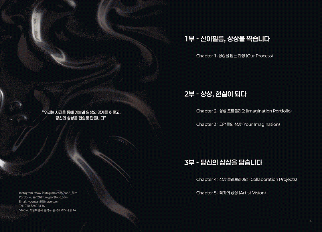 순수사진이 아닌 디지털 사진으로 예술과 일상의 경계를 허물고 접근성을 높이며 기존의 틀에 박힌 패션/사진 시장에서 벗어나 예술적인 사진을 패션, 화보등에 접목, 상상을 촬영하는 브랜드입니다.