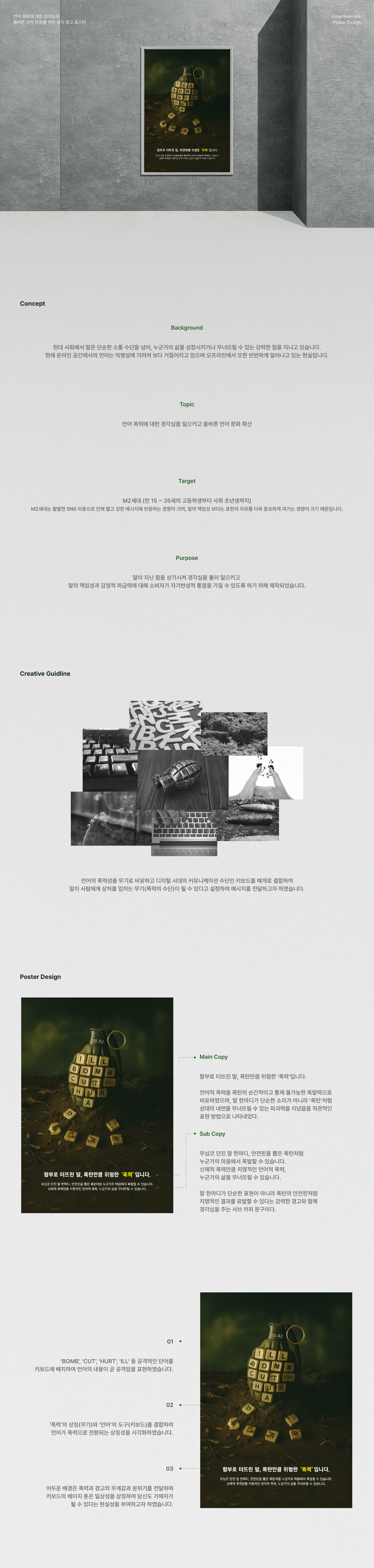 한국에는 ‘말이 씨가 된다’는 속담이 있습니다. ‘말이 씨가 된다’라는 속담은 우리의 말이 생각보다 큰 영향을 미친다는 의미를 담고 있습니다. 현재 우리는 오프라인과 온라인 모두 누군가를 차별하고 비난하는 말을 쉽게 찾아볼 수 있습니다. 그러나 우리가 일상 속에서 무심코 던진 말 한마디가 누군가에게는 깊은 상처를 남길 수 있습니다. 특히, 현대 사회에서는 오프라인과 온라인을 막론하고 다른 사람을 차별하고 비난하는 말을 쉽게 찾아볼 수 있습니다. 그렇기 때문에 말이 지닌 힘을 상기시키며, 더 나은 소통을 위한 경각심을 불러일으키기 위한 공익 광고 포스터를 제작하고자 합니다.