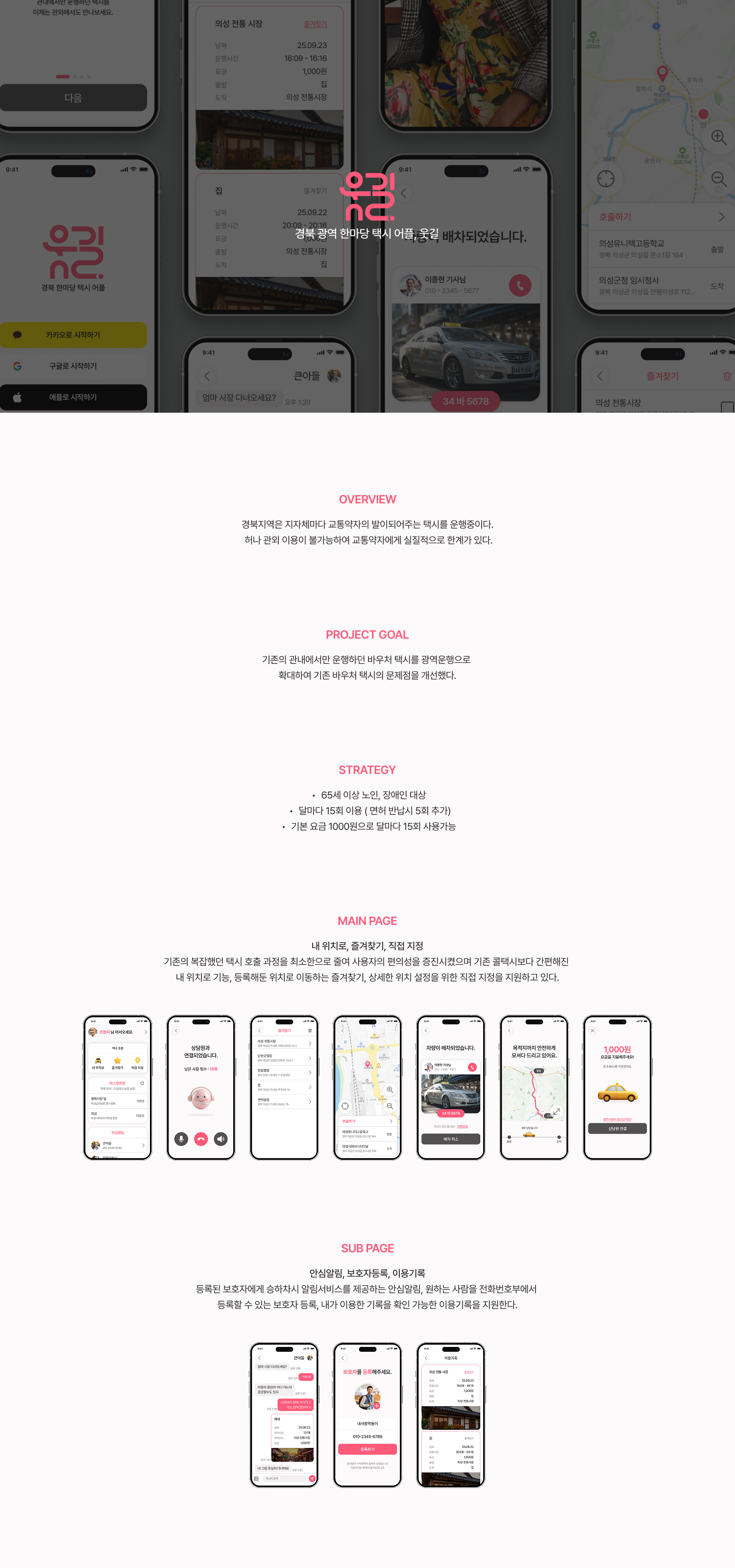장애인, 노인, 어린이, 임산부, 영아동반자 등등 다양한 교통약자를 위해 택시, 오토바이 트럭 등등 사람에서 그치지 않고 짐 또한 옮겨주는 종합운송 어플로 내 아이 안심 택시, 편리한 UI등 사용자 친화적인 인터페이스로 운영하며 사용자에서 더 나아가 판매자인 택시 기사님들의 입장에서 한번 더 생각하여 배려하는 어플이다.