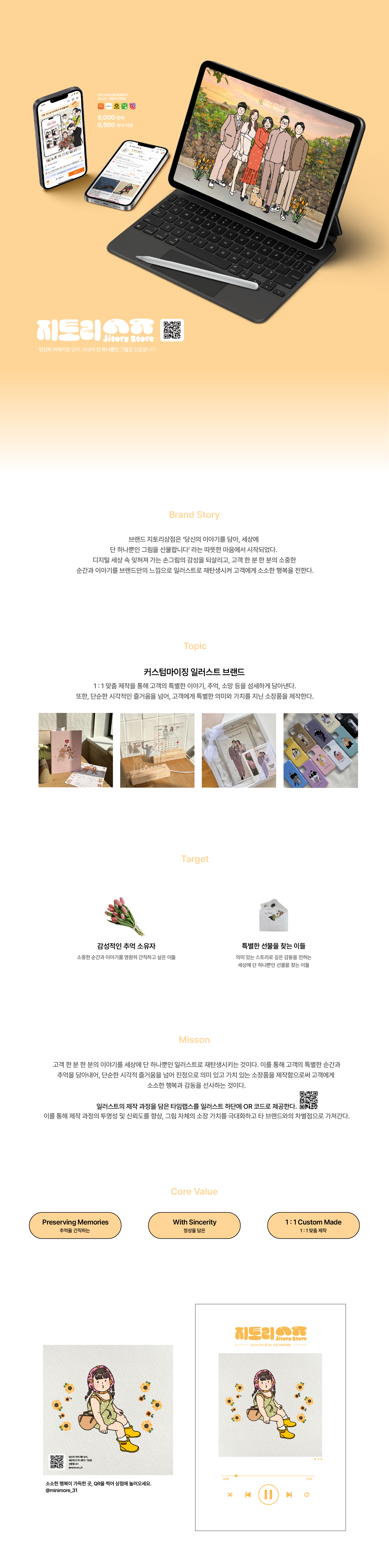 지토리상점은 ‘당신의 이야기를 담아, 세상에 단 하나뿐인 그림을 선물합니다’ 라는 따뜻한 마음에서 시작되었습니다. 디지털 세상 속 잊혀져 가는 손그림의 감성을 되살리고, 고객 한 분 한 분의 소중한 순간과 이야기를 브랜드만의 느낌이 담긴 일러스트로 재탄생시켜 소소한 행복을 전하고자 하는 브랜드입니다. 또한, 단순한 시각적인 즐거움을 넘어, 고객에게 특별한 의미와 가치를 지닌 소장품을 제작해 직접 판매합니다.