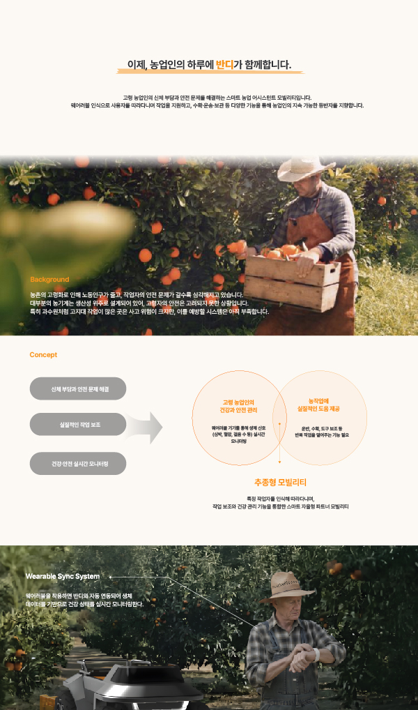 고령화가 빠르게 진행되는 농촌 현실 속에서, 작업자의 건강과 안전을 실질적으로 보조하는 새로운 형태의 모빌리티를 제안한다. 이 모빌리티는 웨어러블 기기와 연동되어 특정 사용자를 인식하고, 작업자의 뒤를 따라다니며 작업을 지원한다. 또한 작업자의 건강 상태를 실시간으로 모니터링하며, 단순한 농기계를 넘어 하루를 함께하는 지속 가능한 파트너를 목표로 한다.