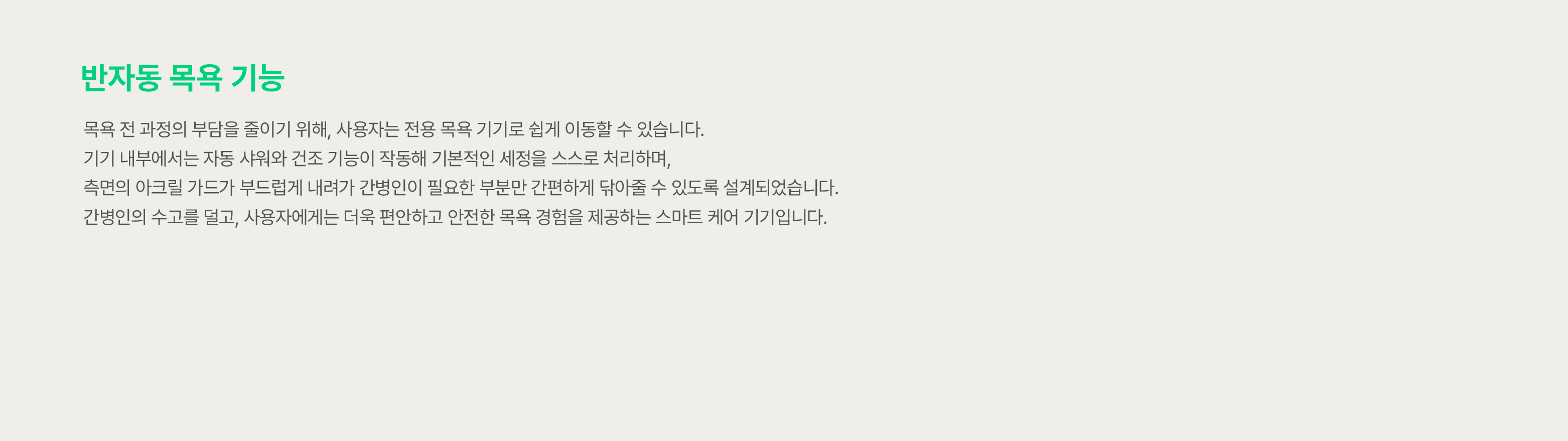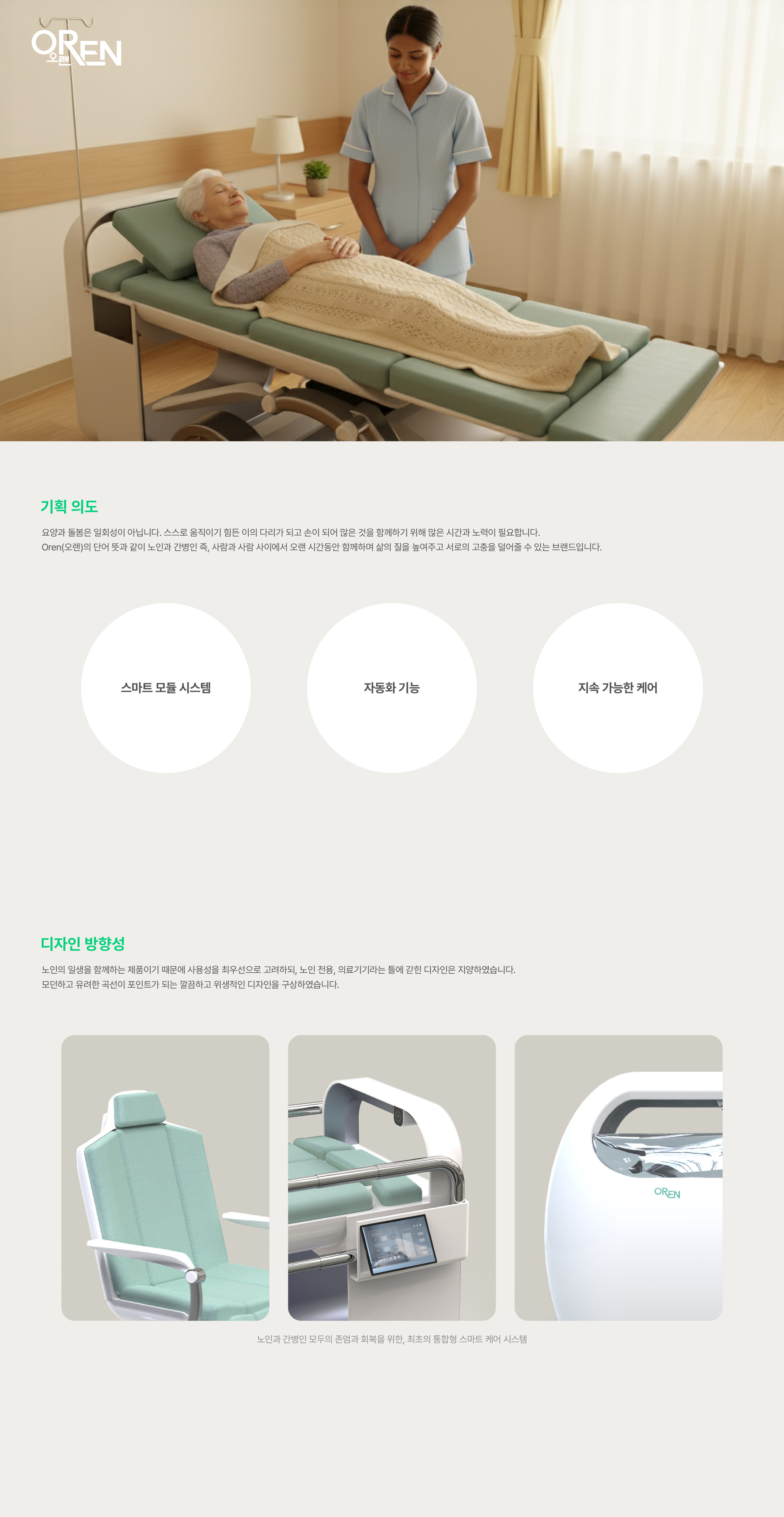 "사람 중심의 기술", "자율성과 회복을 돕는 케어", "돌봄의 재정의" 우리는 노인과 간병인 모두가 존중받는 새로운 요양 환경을 만들고자 한다. 단순한 제품이 아니라, 일상을 누릴 수 있도록 설계된 스마트 케어 시스템.